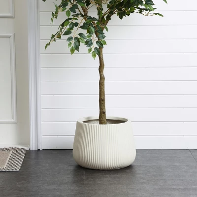 Introducing our 15.6-inch off-white ribbed round planter, a perfect blend of durability and lightweight design. Crafted from high-quality MgO and fiberglass, it is built to withstand various weather conditions while maintaining its aesthetic appeal. The ribbed exterior not only enhances its visual interest but also provides a secure grip for easy handling. With an integrated drainage hole at the bottom, this planter effectively prevents overwatering, promoting healthier root growth for your plants. Its modern minimalist style makes it an excellent addition to any setting, whether placed on a balcony, in a living room, or in an office corner, adding a touch of beauty to your space.