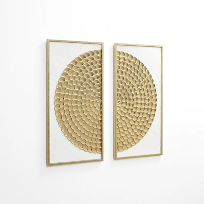 Bring modern rustic charm to your home with this 2-piece white and distressed gold metal wall art set. Each panel features a textured circular pattern in layered gold tones on a crisp white background, creating a stunning focal point. The distressed finish adds vintage character, while the sturdy iron construction ensures durability. Perfect for living room sofa walls, above bedroom headboards, in entryways, or staircases, this set adds depth and style to any space. Easy to hang and versatile in design, it’s the ideal accent for a sophisticated home.
