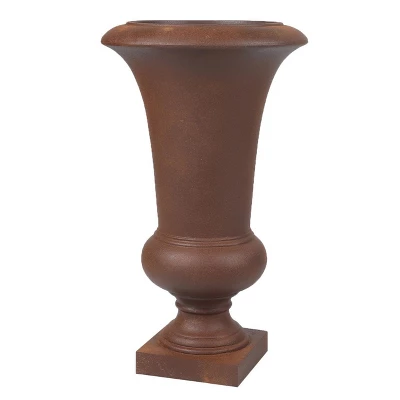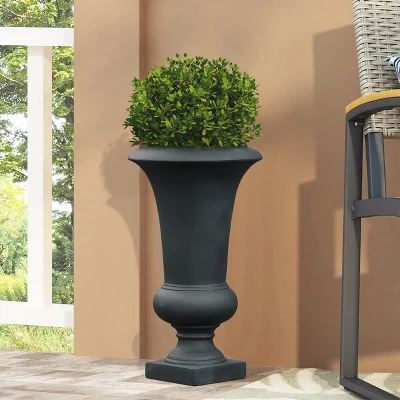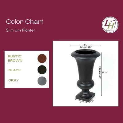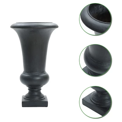 Grow greenery on the front porch or give the backyard an artful upgrade with this eye-catching curvy urn planter. A must-have for your plants, the planter features a classic urn silhouette with a turned pedestal base and a tapered body. The slim profile is space-saving and is available in gray, black, or brown – each works well with multiple designs. Designed to live outdoors, it is crafted from weather-resistant magnesium oxide material that doesn’t mind UV light beaming down or rainstorms rolling through. The planter includes a drainage hole and drainage plug. Features:Â Stately design for indoors and outdoors: this urn planter is a great focal point for your entry, front porch, walkway, or patio with its fluted top and slender silhouette. . Hand-painted finish: the urn is painted with great care in a stone gray finish, black, or rustic brown. Resistant finish: the planter pot has a weather, UV, and rust-resistant finish to aid in the longevity of the planter. Plant care: the urn planter has a drainage hole to help prevent the over-watering of your plants and flowers (drainage plug included for convenience). Unique and stylish gift: the planter makes a beautiful gift for housewarmings and other special occasions. Easy to maintain: clean the planter, rinse it with clean water, and allow it to air dry. Care tip: place the planter on flat ground or surface; it is best if the planter is not left in standing water or snow for long periods as this may cause damage to the base of your planter. Color Options: Stone gray Black Rustic Brown Dimensions: Planter size: 22.75″ H x 13.13″ Diameter Interior planter size: 21.94″ H x 8.13″ Diameter Base: 7″ W x 7″ D Planter weight: 15.4 lbs. Planter potting capacity: 62.1 quarts..
