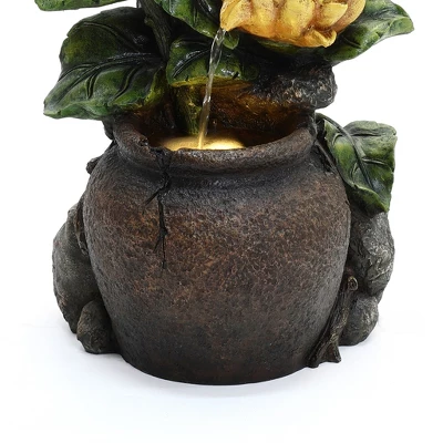 This 28 inch tall outdoor water fountain combines a nature-inspired design with relaxing cascading water sounds, making it the perfect decorative water feature for your garden, patio, backyard, or deck. Crafted from high-quality, weather-resistant resin, this durable outdoor fountain features an elegant three-tier waterfall system, with water gently flowing down the sunflowers, creating a calming ambiance for any space.Equipped with built-in LED lights, this illuminated garden fountain provides a stunning visual effect at night, enhancing the atmosphere in outdoor living spaces. The powerful yet quiet submersible pump ensures a steady and smooth water flow, adding a peaceful, Zen-like element to your surroundings..