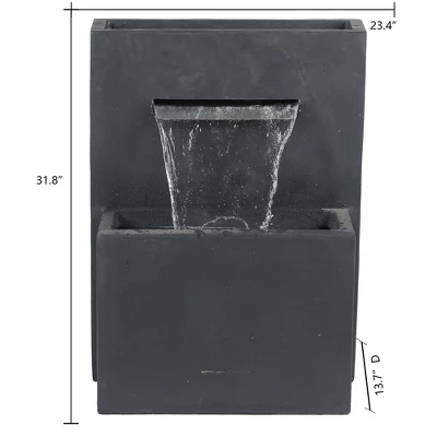 Waterfall fountains create a relaxing and calm environment for your outdoor living space. This fountain has a neutral gray finish that works well in most designs. The rectangular silhouette of this fountain makes it ideal for placing near walls or fences. The minimalist design of the fountain is visually stunning giving your space depth and dimension. This fountain, crafted from quality polyresin material, is ready for the great outdoors! The top section of the fountain is also a cachepot planter that is perfect for showing off your favorite plants and flowers. Enjoy the waterfall feature of the fountain while the electrical pump recirculates the water. The beautiful modern-style fountain is visually appealing, and the waterfall has a meditative feel that beckons relaxation.