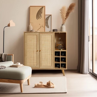 - MId-century modern design: the wine and storage cabinet features rattan doors and open storage space