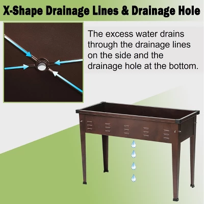 Ideal for planting flowers, plants, vegetables, or herbs, this rugged and attractive raised rectangular steel planter will make a welcome addition to any yard, garden, or patio. The raised planter height is 27.95 inches, making it easier on your back and saving your knees while you tend to your plants. Raised garden beds also have fewer weeds, and regulate water better, which makes them functional, beautiful, and practical. The planter is made from sturdy yet lightweight, powder-coated steel. The steel construction with a dark brown powder-coated finish makes the planter durable, while the rustic painted design blends in beautifully with its surroundings for a natural feel. The planter bed size is 8.07 inches high x 37.8 inches wide x 15.94 inches deep, providing plenty of planting space. Hardware included for easy assembly. Features: Reliable and durable: the raised garden bed planter is made with high-quality steel that is easy to keep clean and will have a long service life. . Resistant finish: the steel is weather, UV, frost, and rust resistant, allowing you to have a garden for every season. . Suitable for all plants: the metal planter is ideal for planting vegetables, herbs, colorful flowers, and other plants. Drainage: the plant bed includes drainage to promote healthy plant root growth without over-watering. Dimensions: Overall size: 27.95″ H x 39.57″ W x 17.72″ D Interior plant bed size: 8.07″ H x 37.8″ W x 15.94″ D Floor clearance: 20.09″ H Product weight: 19.8 lbs. Planter capacity (ounces): 1677.57..