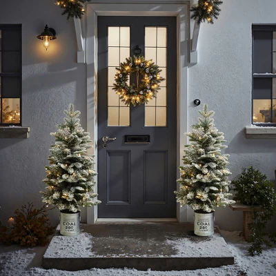 Bring festive charm to any space with this 4-foot snow-flocked artificial Christmas tree. Crafted from a blend of PVC and PE branches, it offers a lush, realistic appearance enhanced by 382 flocked tips. Pre-lit with 100 warm white LED lights, this artificial Christmas tree offers a warm, inviting glow and operates on 4 AA batteries (not included). Nestled in a rustic metal pot, its compact size makes it ideal for entryways, offices, even atop wide tabletops – adding a touch of winter wonder to your holiday decor..