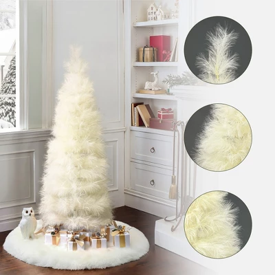 Infuse your space with a lively and artistic atmosphere this holiday season! This 5-foot artistic Christmas tree features a unique fluffy pampas grass design, offering a soft and natural touch to your decorations. Crafted from high-quality polyester, it beautifully mimics the elegant and elongated shape of real pampas grass. The tree’s two-section structure and wrapped branch design make installation easy and efficient. Simply fluff the branches and leaves to reveal a stunning Christmas tree that exudes artistic flair! The sturdy metal stand ensures the tree remains stable. Whether in the corner of your living room, office, classroom, or commercial space, this unconventional Christmas tree serves as a captivating natural art installation..