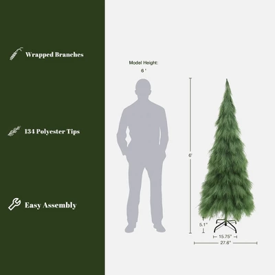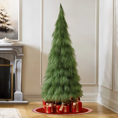 This 6-foot artistic Christmas tree has elevated traditional holiday decorations to a whole new level! We creatively adopted a fluffy reed leaf design and re-shaped the pine needles in an imaginative way – the soft green branches shimmering with a delicate luster under the lights, as if they were forest fairies gently touched by winter morning mist. The unique material selection gives the entire tree an astonishing three-dimensional texture. The three-section structure and branch-wrapped design allow you to easily create your own Christmas tree style – whether it’s the full and plump classic cone shape or the unique and creative posture, you can change it at will with just a few simple steps, creating a fresh atmosphere for the holiday! The bottom is equipped with a stable black stand, ensuring a safe and non-shaking placement. Whether it’s placed in the living room to create a warm atmosphere or used for holiday displays in commercial areas, this unconventional Christmas tree can become the focal point. It is not only a holiday decoration, but also a worthy collectible seasonal art piece, allowing your Christmas season to stand out among many traditional arrangements and telling your own unique holiday story..