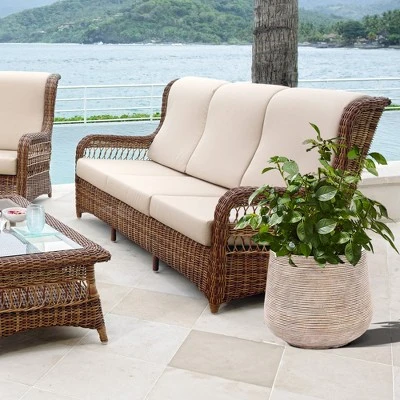 This contemporary-style planter is the ideal setting for showing off your green plants and colorful flowers. Its distressed finish reveals a mixture of tan, white, and gray accents further highlighted by the ribbed design. Whether placed indoors or outdoors, it will complement and enhance the beauty of its surrounding environment. The round planter pot has a drainage hole and plug. The drainage hole helps to prevent over-watering, promotes plant health, and helps plants grow healthily.
