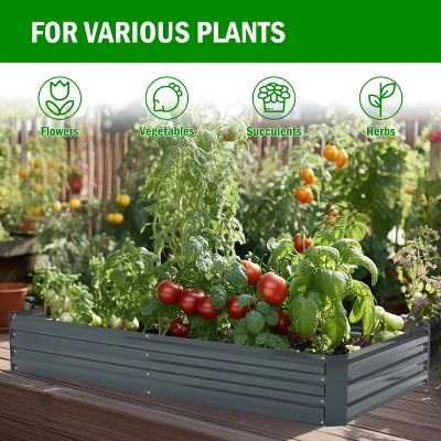 Looking to kickstart your garden? This cool galvanized steel garden planter is just what you need! It’s got a neat rectangular design that’s perfect for growing herbs, flowers, veggies, and annuals. This all-metal garden planter is a great choice for everyone, whether you’re just starting out or you’re a pro. Raised garden beds like this one have fewer weeds and handle water better, making them not just practical but also super attractive. The planter is made of strong yet lightweight galvanized steel and has a nice gray finish that blends right in with your yard. It’s 6-Ft x 3-Ft x 11.8 in. H, so you’ve got plenty of room to plant, and the center rods help keep everything stable and organized. Plus, it’s easy to put together with the included hardware.