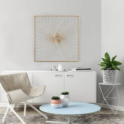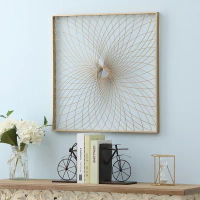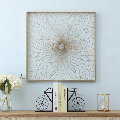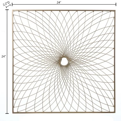This abstract floral metal wall decor makes a statement in any home. The handcrafted piece is constructed of iron in a soft gold-tone finish. It features a square frame around an open design made of a series of curved, spiraling lines, creating a flower shape. The metal flower sculpture has an abstract type design that is unique, and adds elegance to your interior decor. It is an eye-catching decoration to any wall in your home. It is lightweight but sturdy enough, and can be hung alone or with other home wall art. This piece comes with wall-mounting hardware, so it’s easy to hang.