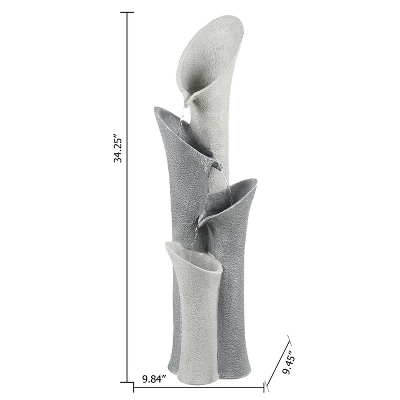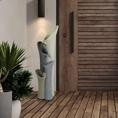 Turn your outdoor space into a tranquil oasis with this artistic tiered fountain. The stately outdoor fountain features four staggered wide-mouth fluted columns. The neutral gray tones of the fountain lends itself as the perfect complement to a natural design. It is crafted from poly resin material, so it is ready for displaying outdoors in your garden, on your deck, porch, or patio. Relax as the water gently cascades from one fluted column to the next. The electric pump is included, and has an adjustable flow rate that allows you to set the water flow to your preference.