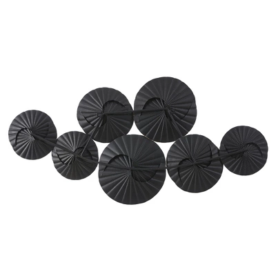 Elevate your space and bring a modern style with a seasoned twist to your home with this stunning abstract wall decor. The distressed finish along with the textured swirl design exudes an artistic elegance with its visually appealing structured seashell type swirl on seven connected round metal discs. Creating a charming addition to nearly any wall, the weathered black, white, and gold tones in different circular shapes fit perfectly into your home’s decorations, adding a rustic modern touch to your interior. This stunning, contemporary piece will be an enchanting piece for the bedroom, hall, foyer or entryway. Other areas for this eye-pleasing abstract art are above the mantel, in the dining room and in the living room. Give your empty wall a lift with this fresh wall decor.