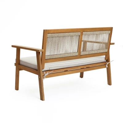 Imagine the warm, natural texture of outdoor furniture crafted from 100% FSC-certified Acacia wood as sunlight filters through the leaves, harmonizing beautifully with a modern minimalist design. This outdoor furniture set includes a loveseat, two armchairs, and a practical coffee table. The cushions are designed with high-quality fabric filling for a soft touch and elasticity, complemented by a rope backrest made from a durable, soft material that provides ultimate comfort. The coffee table matches the minimalist style, catering to various leisure activities. Additionally, an oil finish surface treatment enhances the furniture’s weather and corrosion resistance. Whether placed on a spacious patio or in a garden, this set can serve as a striking centerpiece.