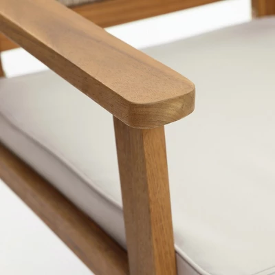 Experience the harmonious beauty of nature with our Outdoor Acacia Rope Back Armchair with Cushion. This armchair redefines outdoor relaxation with its modern minimalist design. Crafted from 100% FSC-certified Acacia wood, it is both environmentally friendly and comfortable. Featuring clean, smooth lines and a unique rope back design, this armchair creates an elegant and serene atmosphere. The oil-finished surface treatment enhances its resistance to weather and corrosion, ensuring durability. Measuring 25.2 inches long, 25.6 inches wide, and 29.13 inches high, this chair is perfect for indoor living rooms, small patios, or decks. It adds a bright touch and enhances the overall style and beauty of any space.