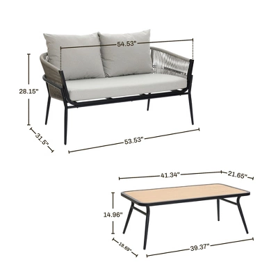 This outdoor aluminum with PE rope loveseat sofa set, with its excellent durability and elegant design, brings a perfect combination of comfort and aesthetics to your outdoor space. The sofa features a sturdy aluminum alloy frame and PE rope material, which can withstand harsh weather conditions and is corrosion-resistant, ensuring long-lasting use. The included coffee table is also made of aluminum alloy, with a finely brushed paint finish that complements the sofa perfectly. The KD (knock-down) design allows for a simple and quick assembly process, which can be easily completed without the need for professional tools. The soft cushions provide additional comfort, making this sofa set ideal for family gatherings or personal relaxation. Moreover, the coffee table is practical and adds convenience to your outdoor living. The overall design is simple yet modern, able to blend with various outdoor decorative styles, making it the best choice to enhance the quality of your outdoor life..