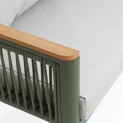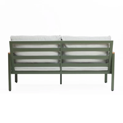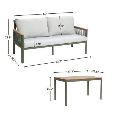 This outdoor aluminum loveseat sofa and coffee table set is a fine set tailored for your outdoor living space. It combines modern design aesthetics with superior performance, featuring a sturdy aluminum alloy frame and plastic with a wood-like appearance materials that ensure the product’s durability and visual appeal. The sofa’s seat and back cushions are filled with 9cm thick 28D high-density foam, offering you an unparalleled comfortable experience. The coffee table’s top is not only attractive but also easy to clean and maintain. The knock-down design makes assembly quick and simple, allowing you to enjoy your outdoor leisure time without delay. Whether it’s a family gathering or a moment of solitude, this sofa set can meet your needs and become a highlight of your outdoor space.