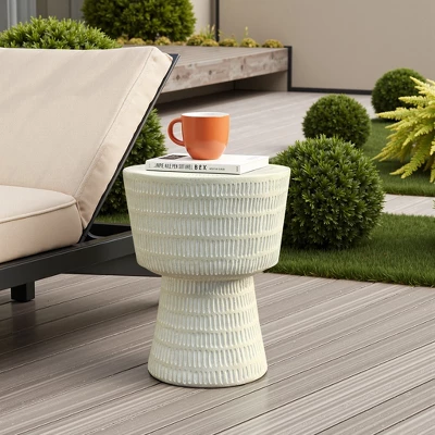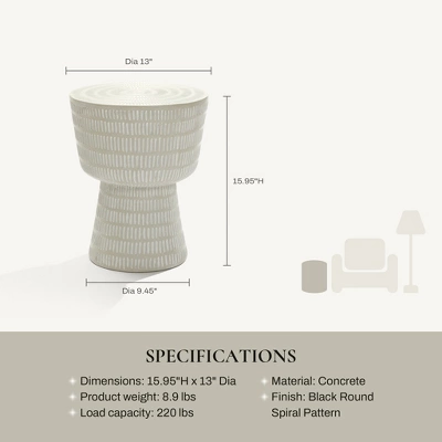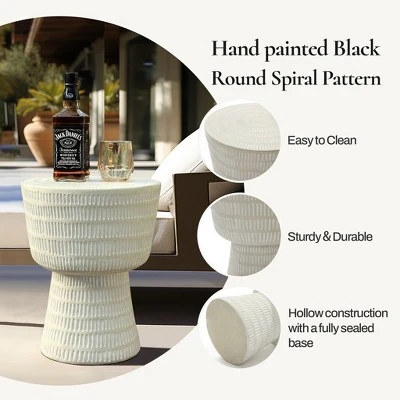 Elevate the ambiance of your outdoor living area with the addition of this exquisitely crafted outdoor side table. Constructed from high-quality magnesium oxide material, this table boasts exceptional strength and durability. The spiral-shaped tabletop, adorned with a captivating striped design of varying surface sizes, adds a distinctive and sophisticated touch to your space. Not only is this table stylish, but it is also highly functional. In a modern off white finish with white accents, this side table effortlessly enhances the natural beauty of your surroundings with its sleek and minimalist appearance. Perfectly suited for placement next to a chat set or combination sofa, this table is an ideal complement to any terrace, patio, or deck.