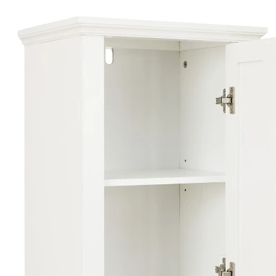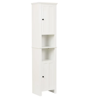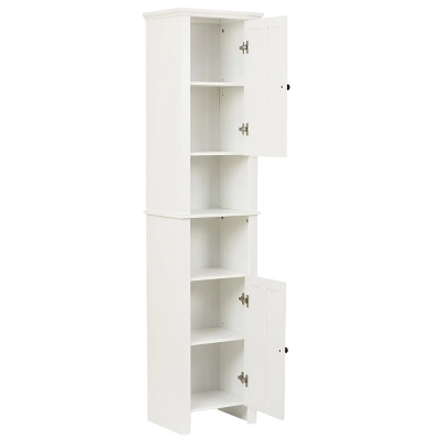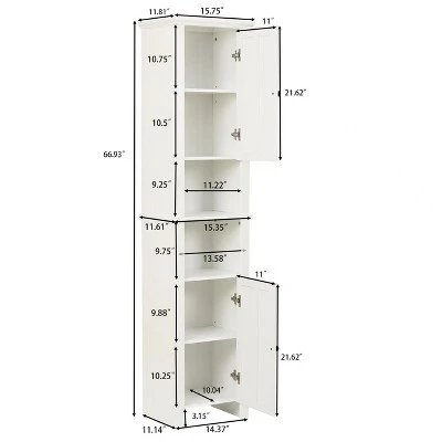 The storage tower cabinet fits nicely in any bathroom, bedroom, mudroom, or any room in the home where extra storage space is needed! You will love the roomy interiors this 67-inch bathroom storage cabinet offers. It is a stylish solution for any area and offers vertical access to towels and a host of other accessories with two doors plus open shelving. One upper, and one lower cabinet offer out-of-sight storage for toiletries, towels, and bathroom supplies, while two open shelves are great for go-to accessories. Crafted of manufactured wood in a clean white finish, this linen cabinet strikes a slender, rectangular silhouette featuring crown moldings, recessed paneling, and black iron hardware. It is an ideal option for a small bathroom. Features: . . . . . . . . . Cabinet Specifications:Â Overall cabinet size: 66.93″ H x 15.75″ W x 11.81″ D Cabinet weight: 45.87 lbs. Shelf weight capacity: 10 lbs. Total weight capacity: 40 lbs.