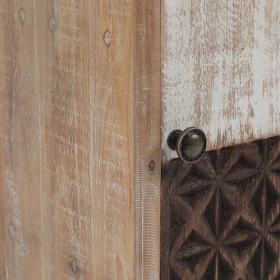 This boho-inspired end table brings a creative and fun style to your bedroom or living room. The side table is made of solid and manufactured wood with a distressed finish for a vintage look. This table features a rectangular shape with one drawer and cabinet for storage. The textured geometric detailing on alternating sections of the drawer and cabinet door add an eclectic feel, and the crescent-shaped drawer pull has antique appeal. The table’s small footprint 15.75″ wide means it fits just right next to your sofa or bed.Features: Care: Use a microfiber cloth or a disposable electrostatic duster to remove dust. Use a paper towel or soft cloth to blot away liquid spills and condensation from drinks immediately. Wipe away the mess and immediately use a dry microfiber cloth to dry the wood and restore it back to its original finish. Specifications: Product Size: 28.5″ H x 15.75″ W x 12″ D Product Weight: 13.1 lbs. Drawer Dimensions:6.25″ H x 13.375″ W x 10.75″ D Cabinet Dimensions: 15.75″ H x 13.375″ W x 11.8125″ D Weight Capacity: 150 lbs. Product Color: Natural wood, white, brown, black